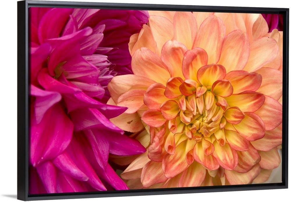 <p>Two very brightly colored flowers with many curved petals side-by-side in a romantic bouquet.</p>