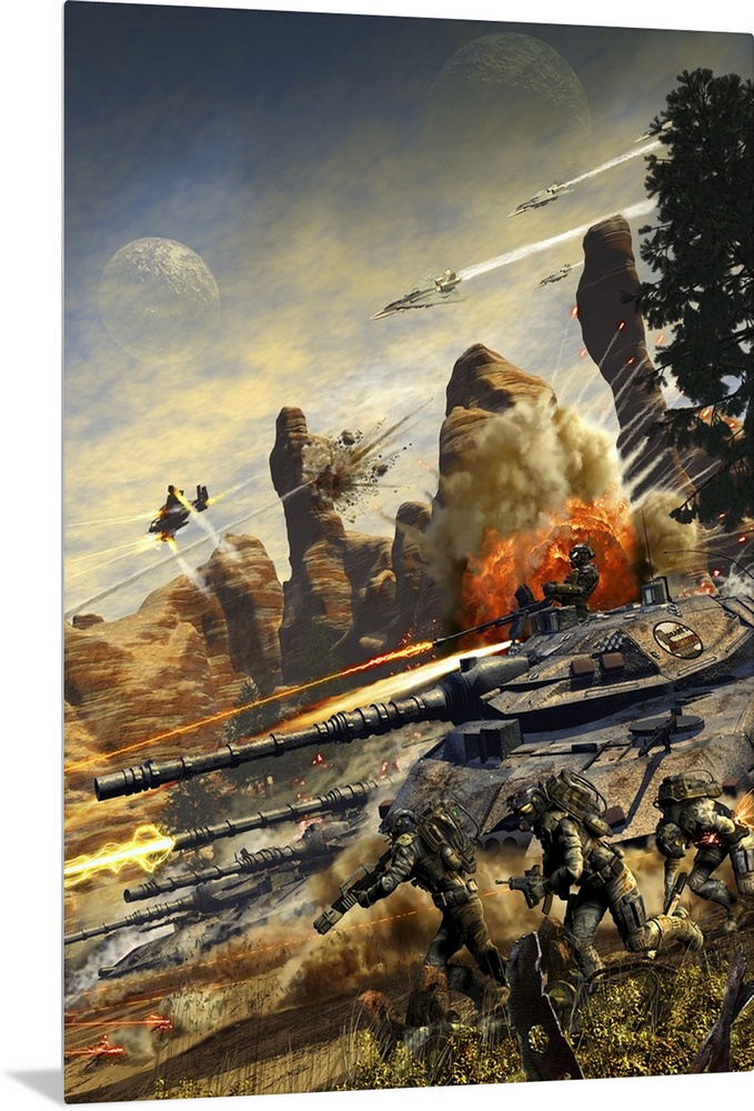 <p>Futuristic hover tank platoon charging downhill.</p>