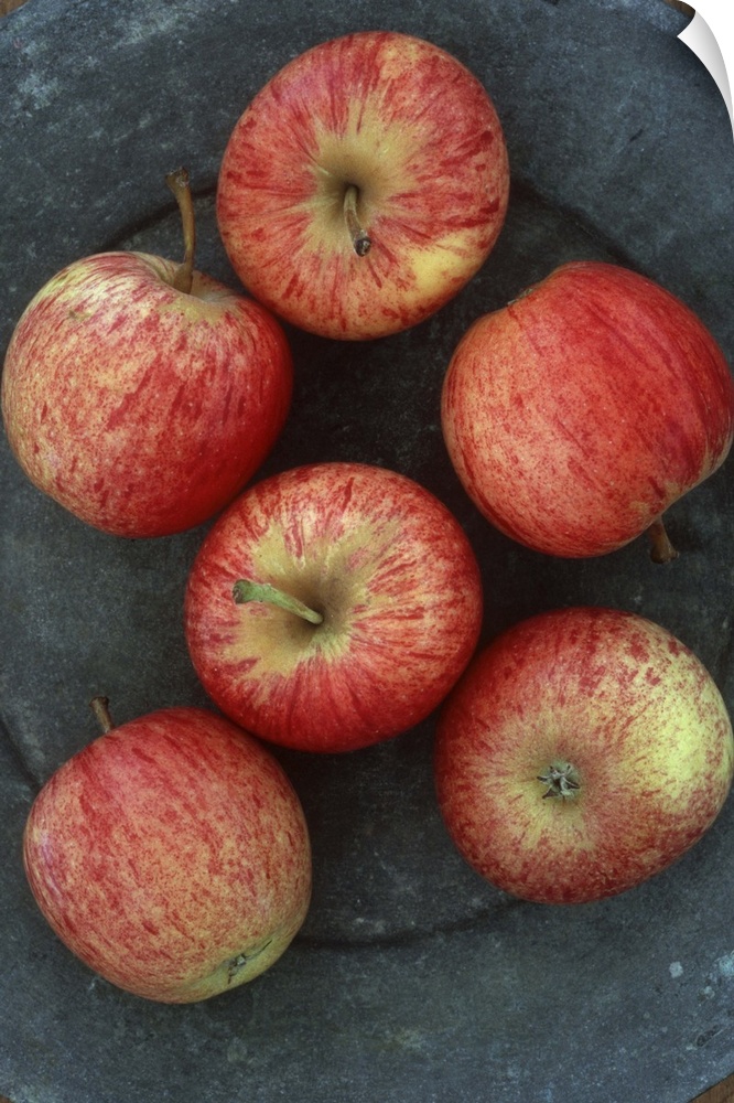 <p>Six red and yellow striped Gala apples on tarnished metal plate</p>