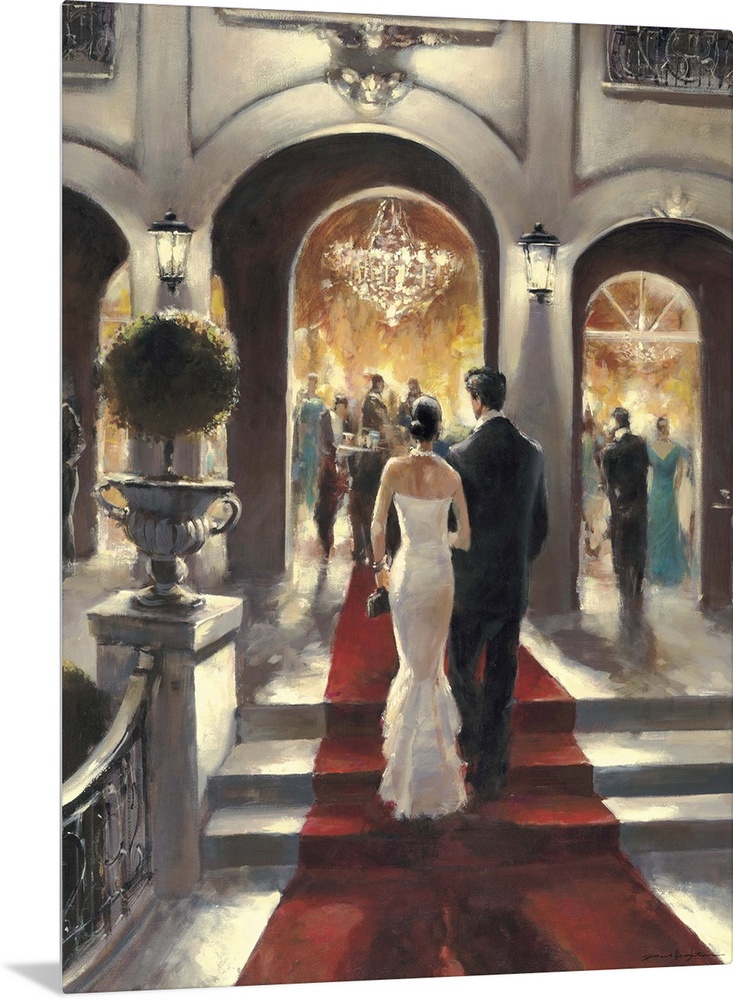 <p>Contemporary painting of a couple in formal evening attire walking along a red carpet.</p>