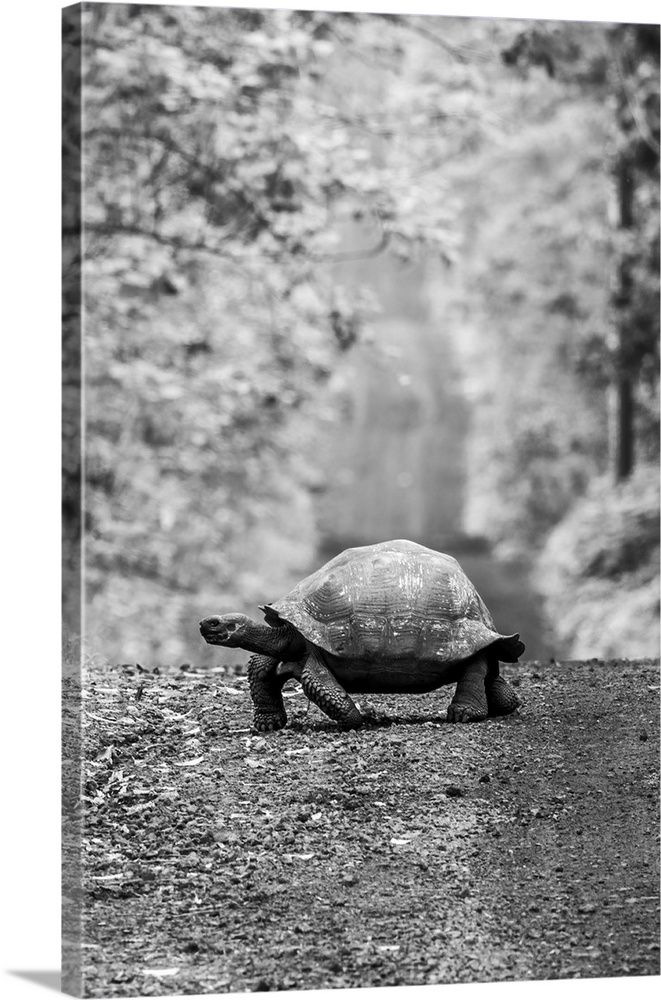 <p>Galapagos giant tortoise (chelonoidis niger) crossing a dirt road in the forest, Galapagos islands, Ecuador.</p>