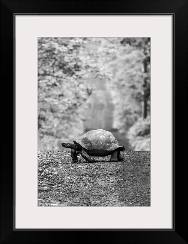 <p>Galapagos giant tortoise (chelonoidis niger) crossing a dirt road in the forest, Galapagos islands, Ecuador.</p>
