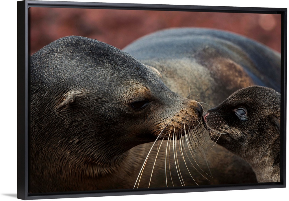 <p>Galapagos Sea Lion (Zalophus wollebaeki) mother nuzzling pup, Rabida Island, Galapagos Islands, Ecuador.</p>