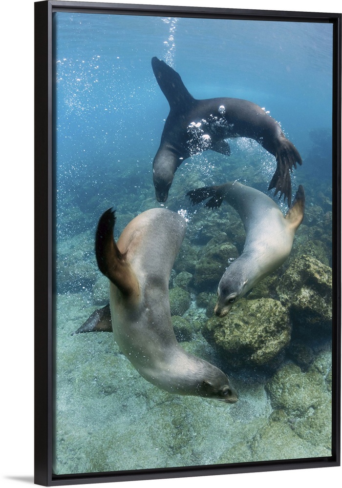 <p>Galapagos Sea Lion trio playing underwater, Champion Island, Floreana Island, Galapagos Islands, Ecuador.</p>
