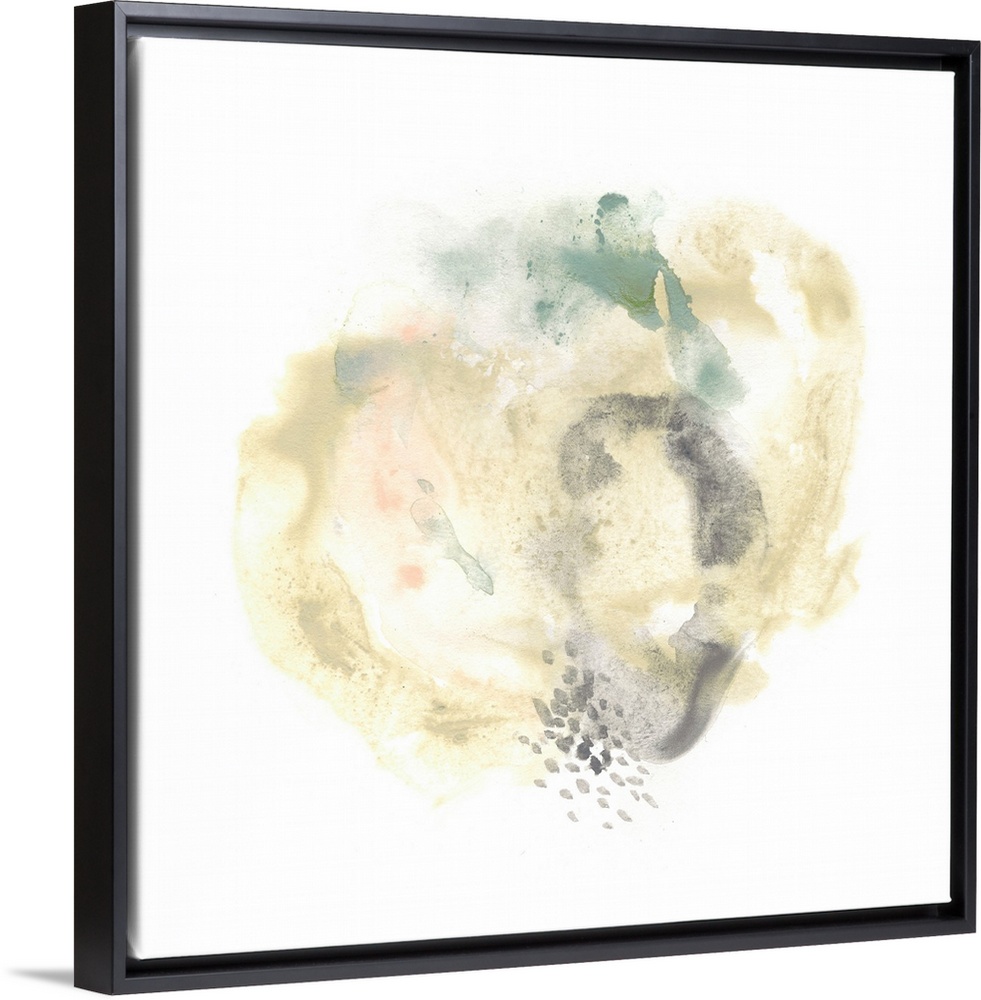 <p>Abstract watercolor painting in a round organic shape in grey and pale yellow-green.</p>