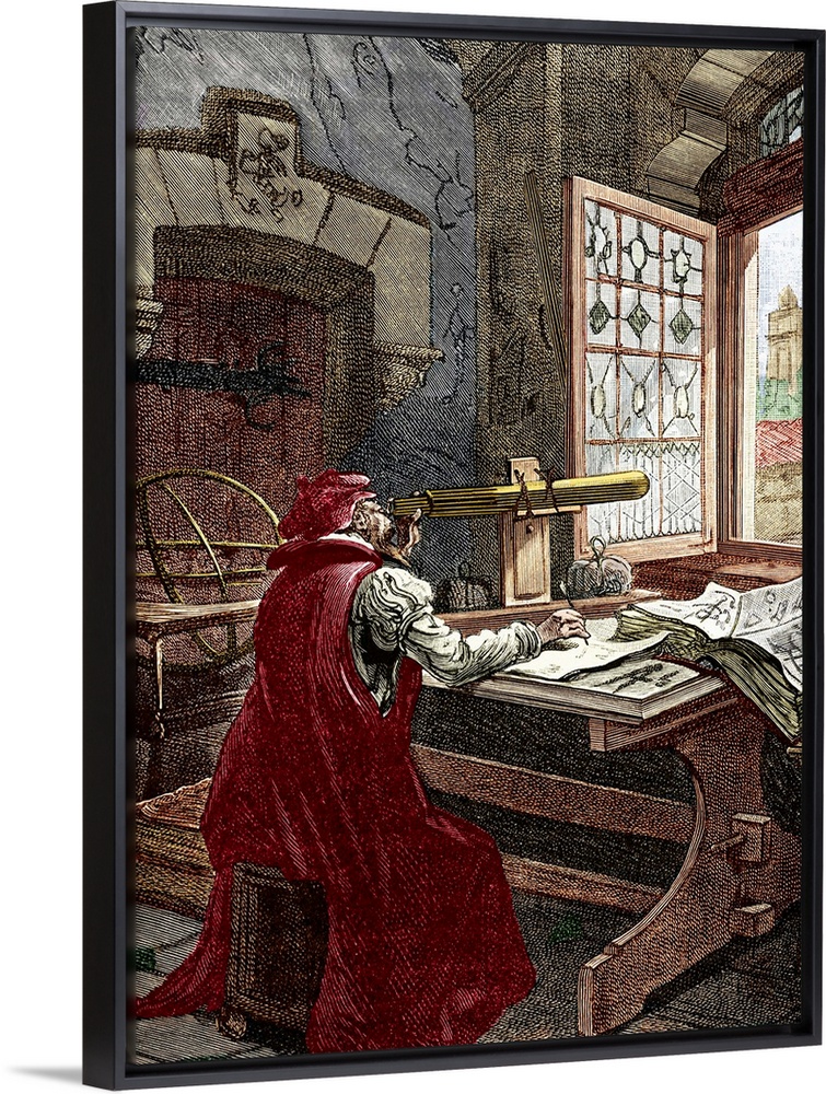 <p>Galileo using a telescope, historical artwork. The Italian astronomer and physicist Galileo Galilei (1564-1642) is famed for his 1610 use of his telescope to discover the four largest moons of Jupiter. He also observed mountains on the Moon. In physics, he found that all pendulums swing with the same time period, and that heavy and light objects fall at the same rate. He supported the Copernican theory that the Sun, rather than the Earth, was at the centre of the solar system. This belief was declared heretical in 1633 by the Inquisition of the Roman Catholic Church. He was held under house arrest for the rest of his life. From Physique Populaire (E. Desbeaux, 1891).</p>