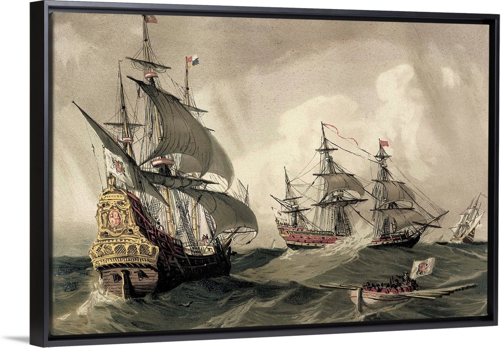<p>Galleons and other spanish sailing ships of the 17th century. Painting. SPAIN. Barcelona. Sant Jordi Catalan Royal Academy of Fine Arts. -</p>