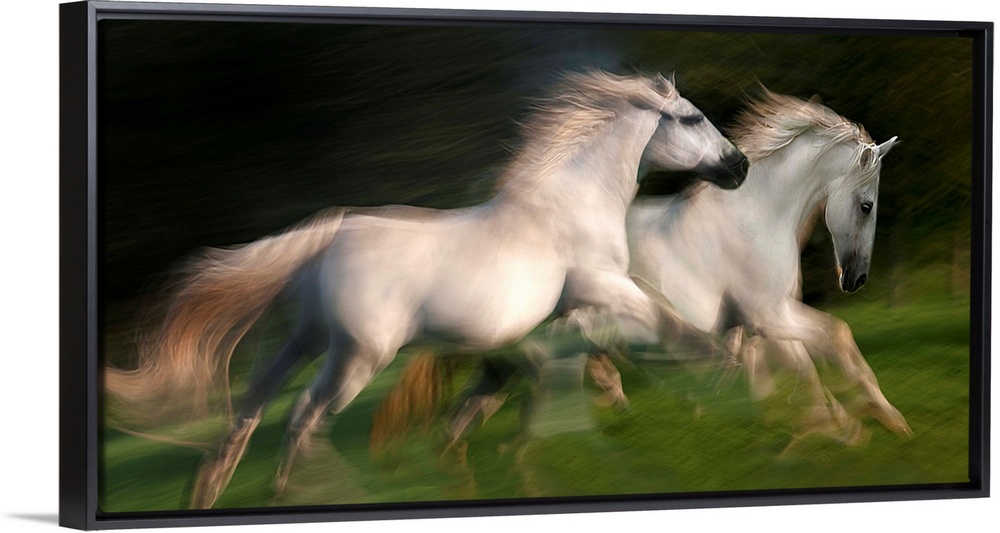 <p>Motion blurred photograph of wild horses galloping side by side.</p>
