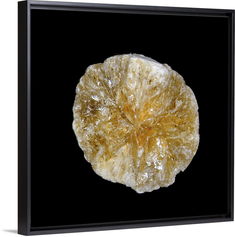 <p>Gallstone fractured to show its crystalline interior. Gallstones form in the gall bladder, a small organ that stores bile, which is produced by the liver, until it is needed. When there is an imbalance in the chemical composition of the bile, cholesterol and bile pigments may crystallise. Over time these crystals can develop into gallstones. Gallstones are usually symptomless unless one obstructs the bile duct, which can cause acute pain, jaundice and infection. Treatment is with drugs to dissolve the stones or surgical removal of the gall bladder.</p>