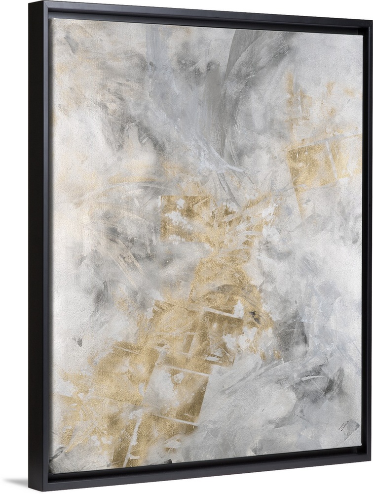 <p>Abstract painting of a textured design in shades of silver and gold.</p>