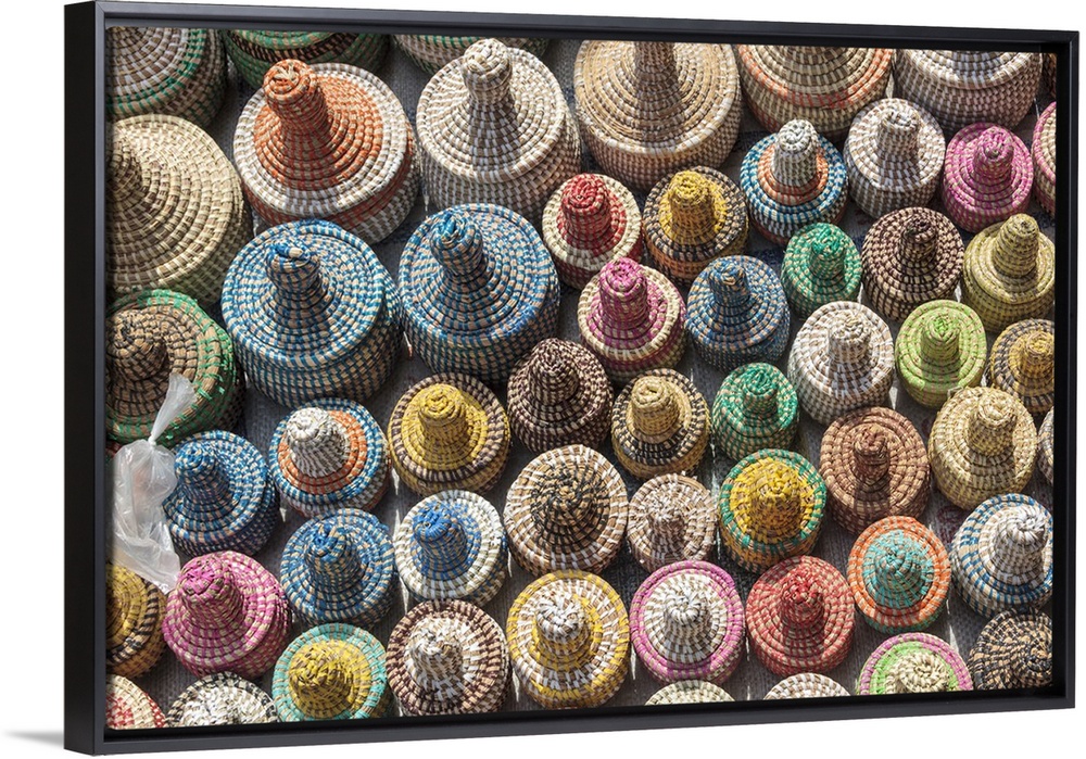 <p>Africa, Gambia, Banjul. Collection of colorful woven baskets viewed from above.</p>