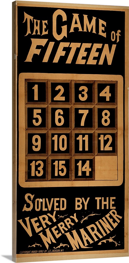 <p>Game of Fifteen. Poster advertising a show where the Game of Fifteen, a mathematical puzzle, will be solved. The game is a sliding puzzle of 15 tiles in a 4x4 grid (as shown on the poster). The tiles are arranged randomly and must be placed in sequential order to solve the puzzle. The puzzle was at its most popular in the USA in 1880.</p>