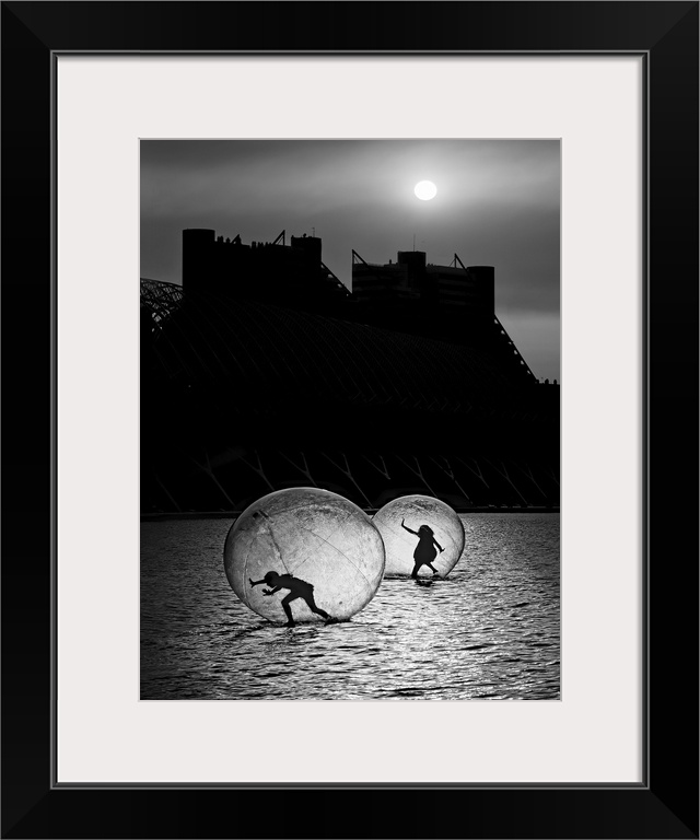 <p>Two human bubbles housing silhouetted figures treading along a watery surface under moonlight.</p>