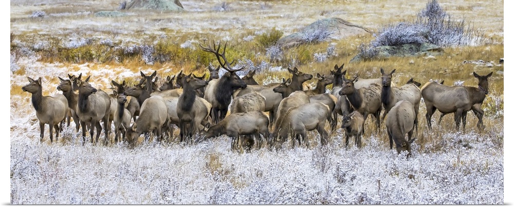 <p>Gang of bull elk (cervus canadensis) and cow elk standing in a field with frost, Denver, Colorado, united states of America.</p>