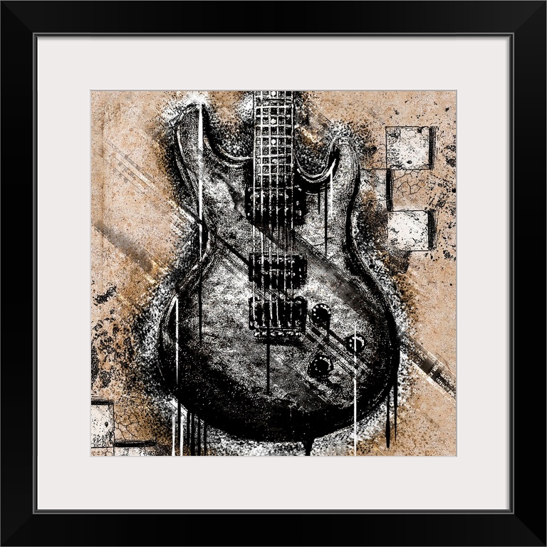 <p>Square panel of an electric guitar with a stenciled effect, with heavy texture and dripping paint.</p>