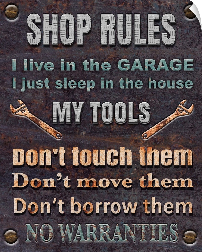 <p>Contemporary home decor artwork of a rustic looking garage shop sign with shop rules.</p>