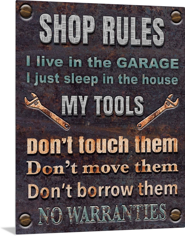 <p>Contemporary home decor artwork of a rustic looking garage shop sign with shop rules.</p>