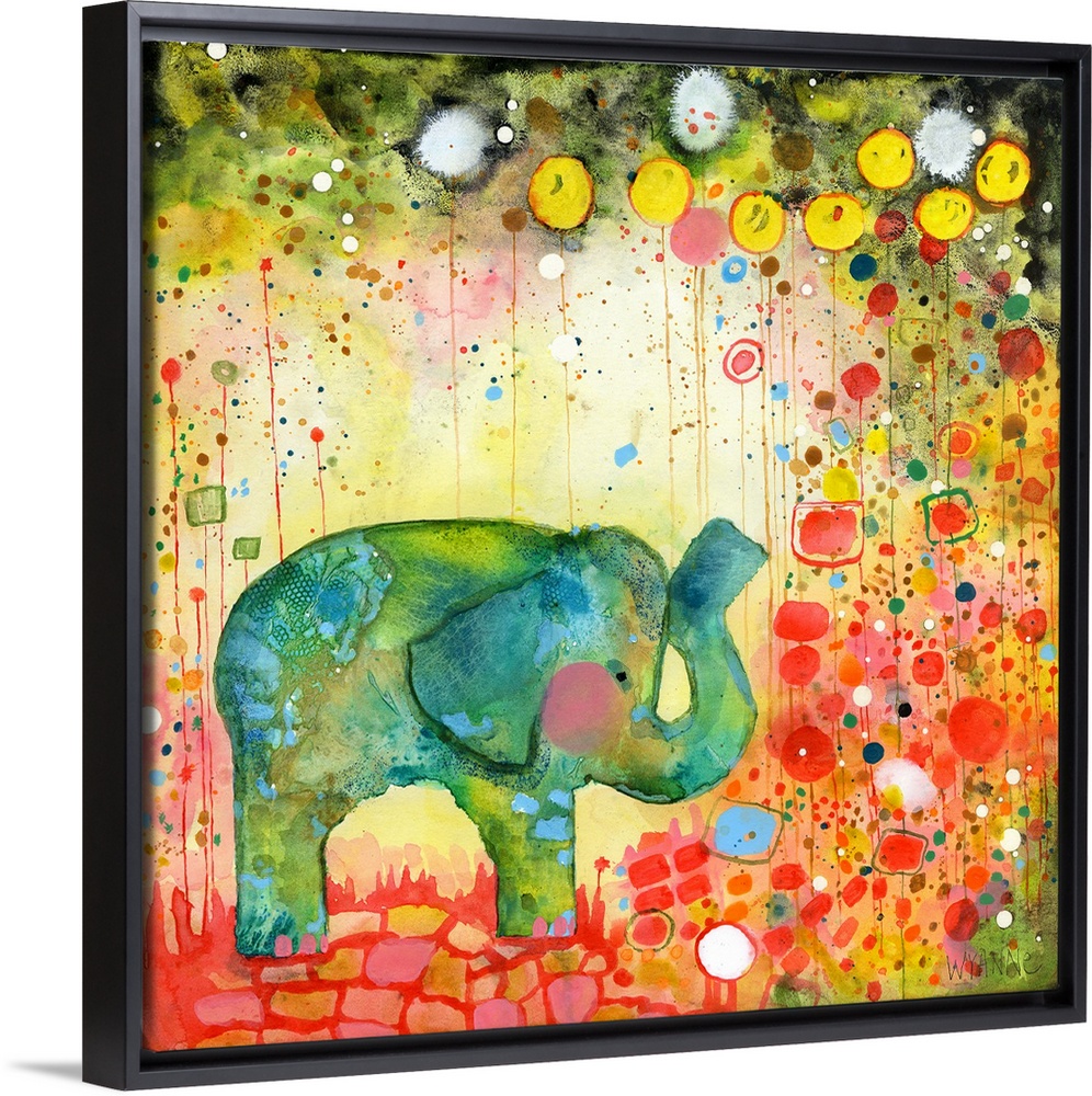 <p>A green watercolor elephant surrounded by colorful flowers.</p>