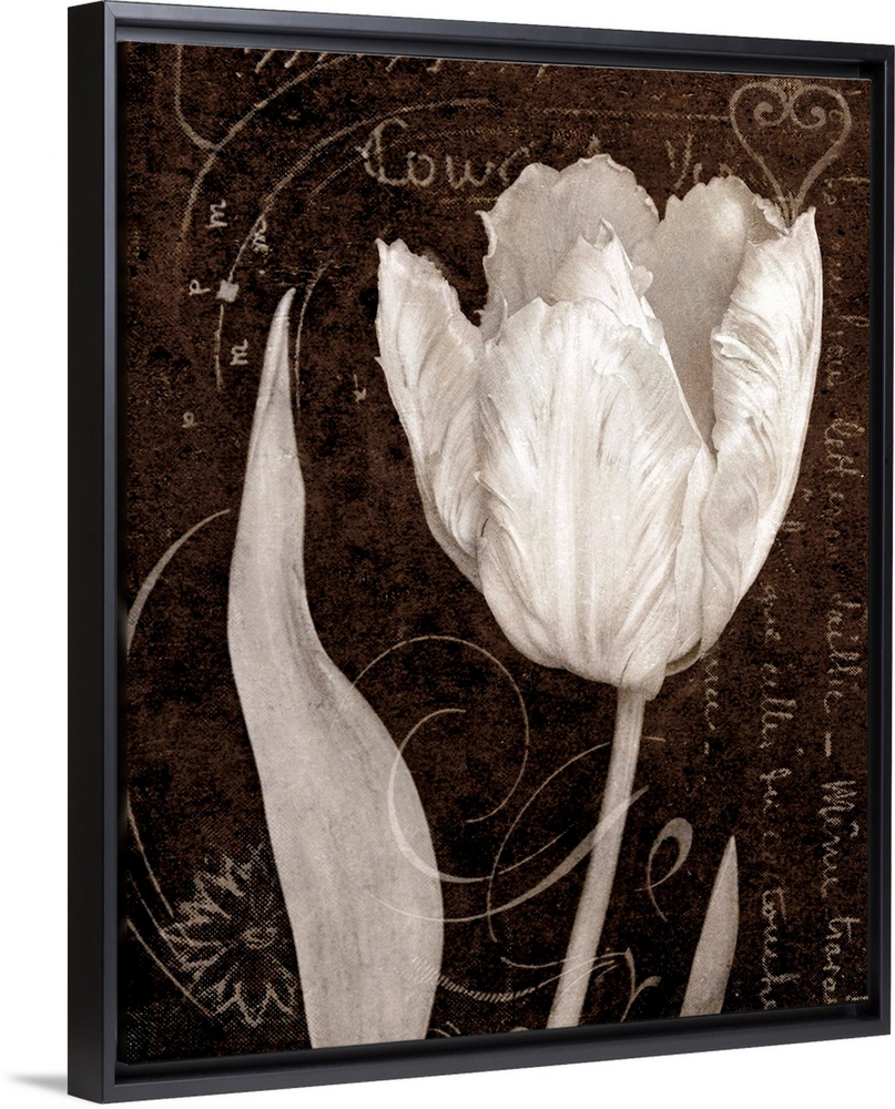 <p>Giant monochromatic floral art accents a single tulip flower sitting in front of a slightly textured background with a few sections of text. Artist also incorporates a number of curved lines, as well as heart and star shapes.</p>