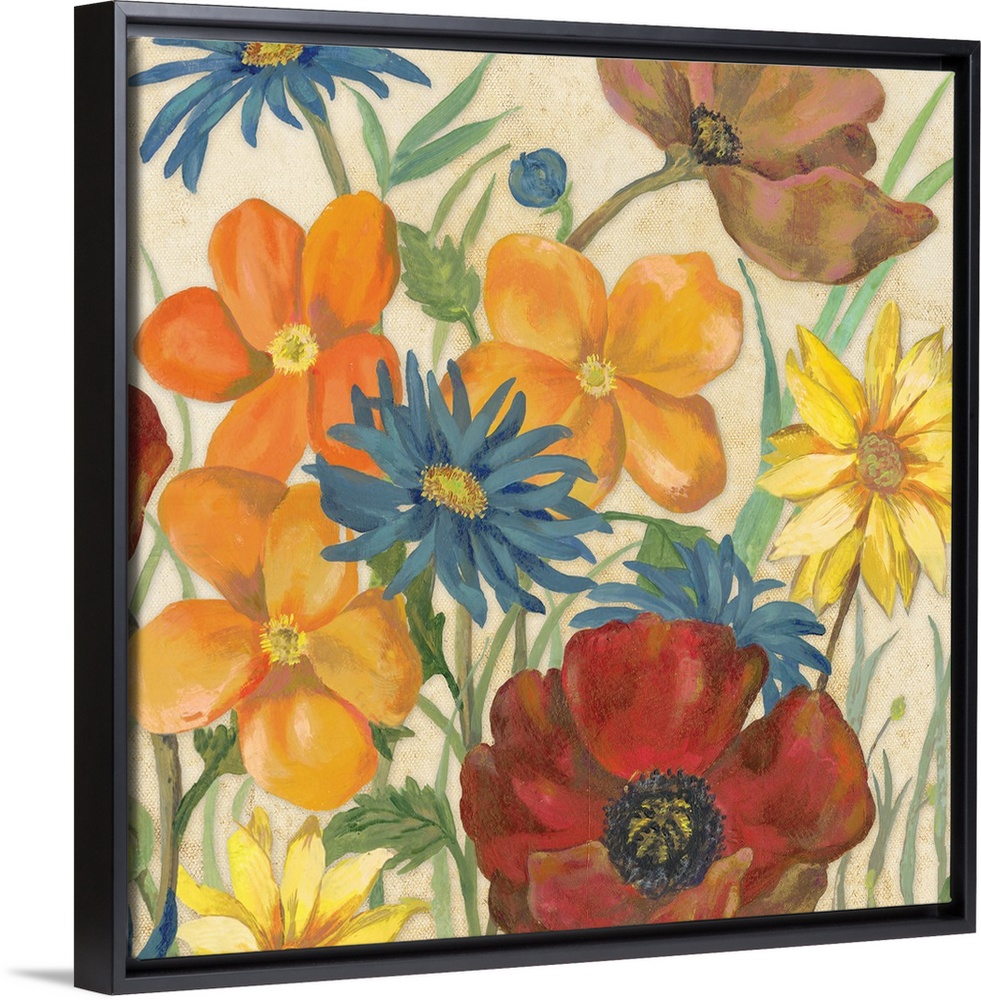 <p>Square painting of red, orange, blue, and yellow flowers on a neutral colored background.</p>