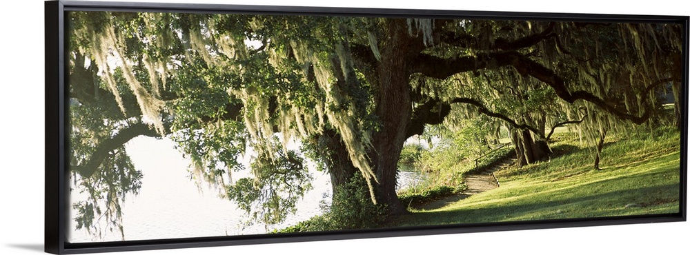 <p>Panoramic photo of a weeping willow tree in a garden along a river.</p>