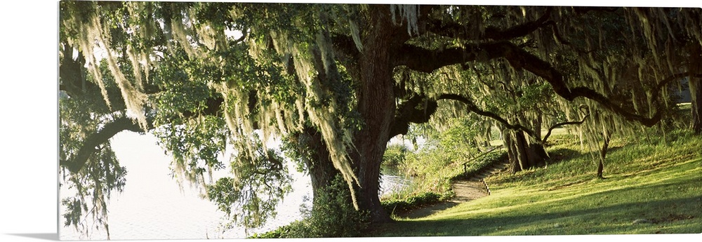 <p>Panoramic photo of a weeping willow tree in a garden along a river.</p>