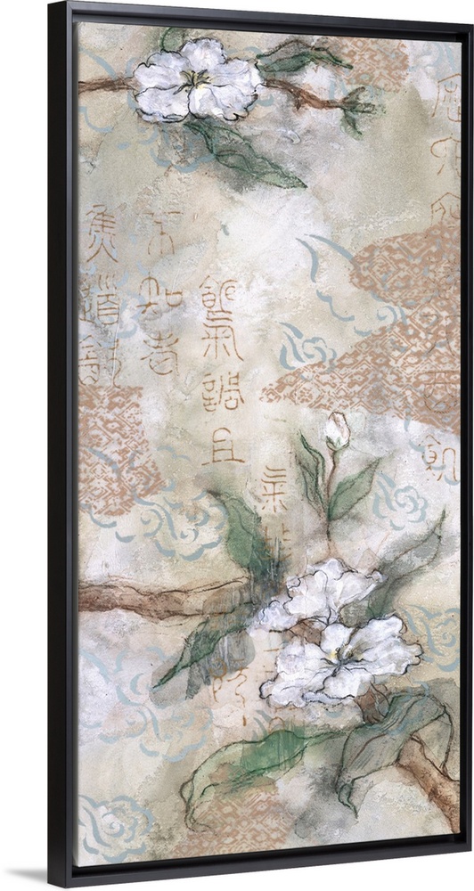 <p>An Asian inspired vertical artwork of white cherry blossoms with Chinese calligraphy overlapping.</p>