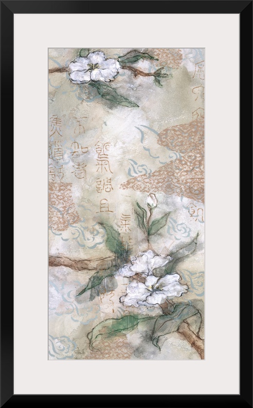 <p>An Asian inspired vertical artwork of white cherry blossoms with Chinese calligraphy overlapping.</p>