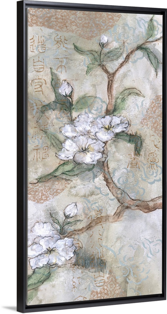 <p>An Asian inspired vertical artwork of white cherry blossoms with Chinese calligraphy overlapping.</p>