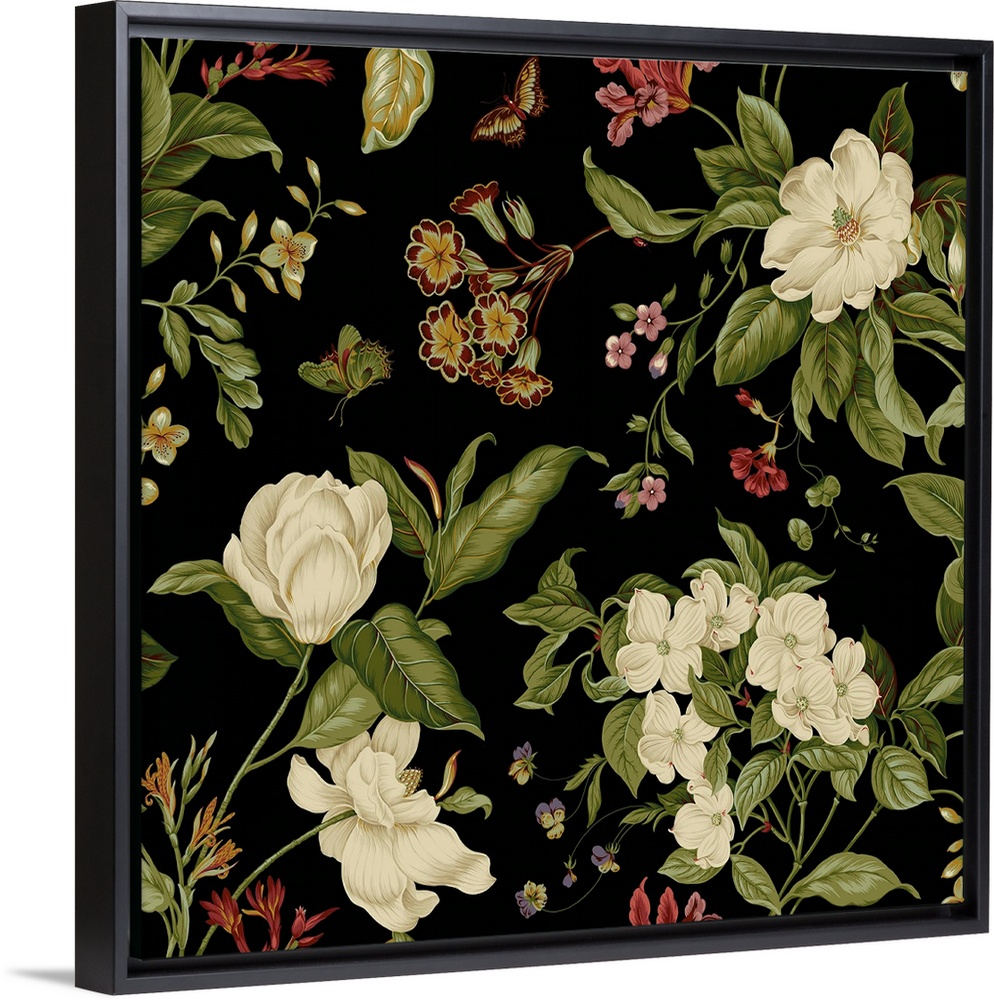 <p>This digital artwork features delicate white flowers and warm colored wildflowers accompanied by luscious green foliage over a black background.</p>