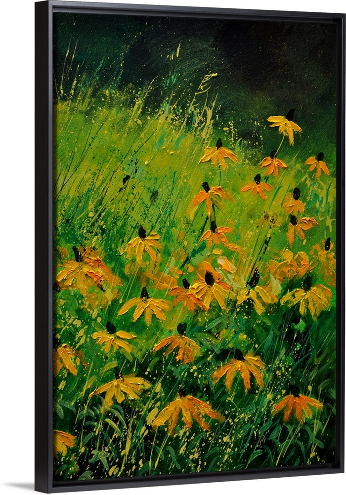 <p>A field of orange flowers among vibrant green grass with small splatter of paint overlapping.</p>