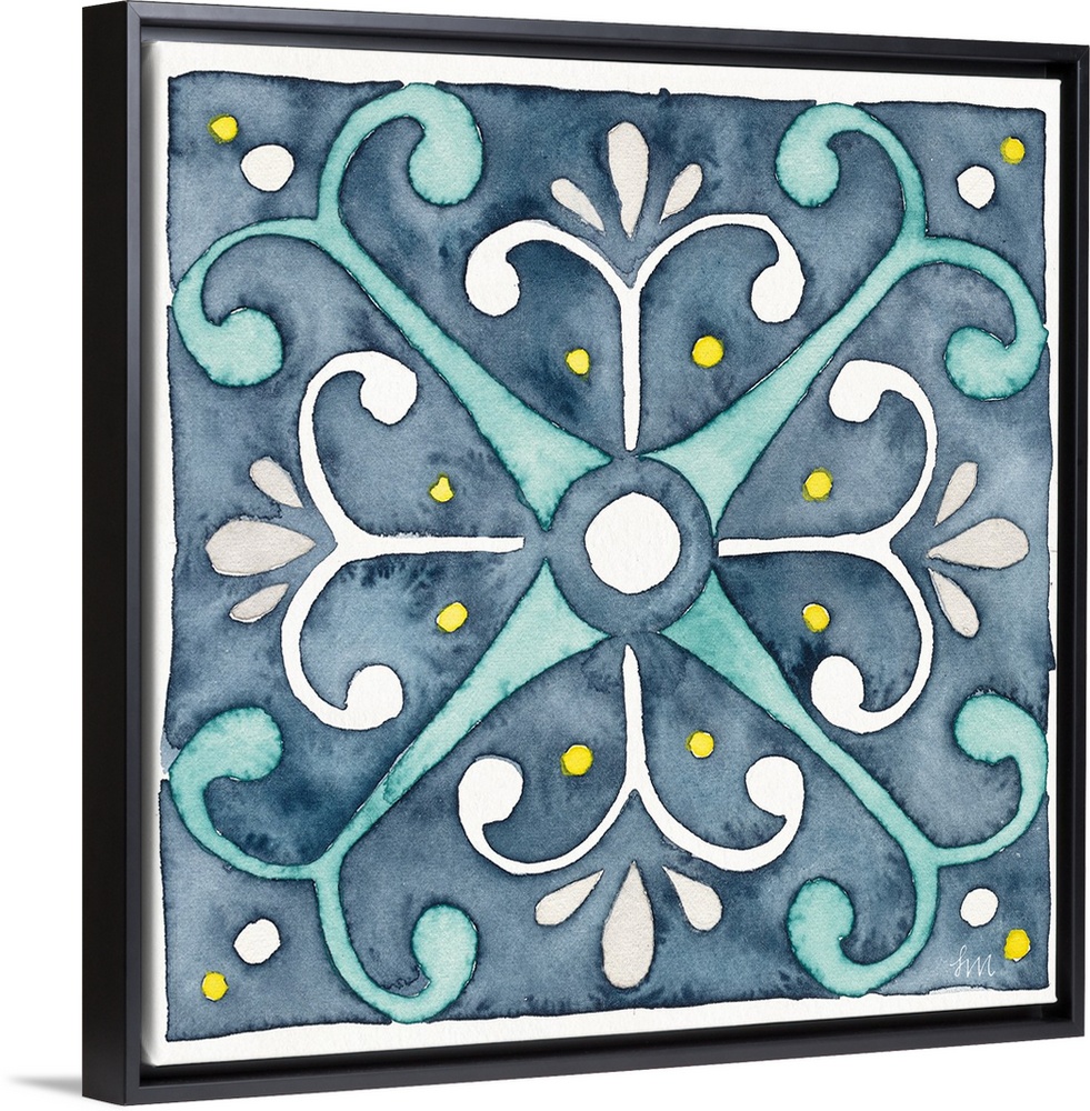 <p>A square watercolor floral design in the style of tile in varies shades of blue.</p>