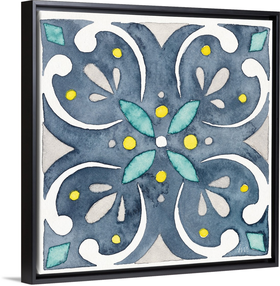 <p>A square watercolor floral design in the style of tile in varies shades of blue.</p>
