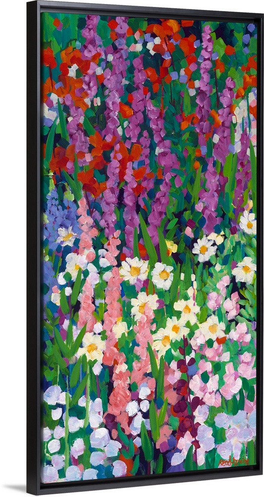 <p>Tall narrow painting of flowers in a garden with daisies and red and purple spired blooms.</p>