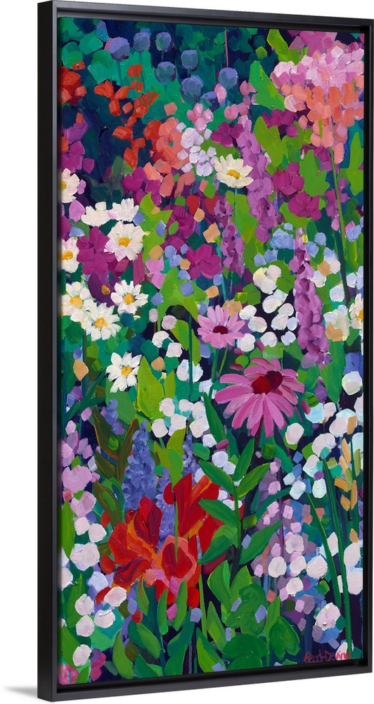 <p>Tall narrow painting of flowers in a garden with daisies, a pink coneflower and multicolored blooms.</p>