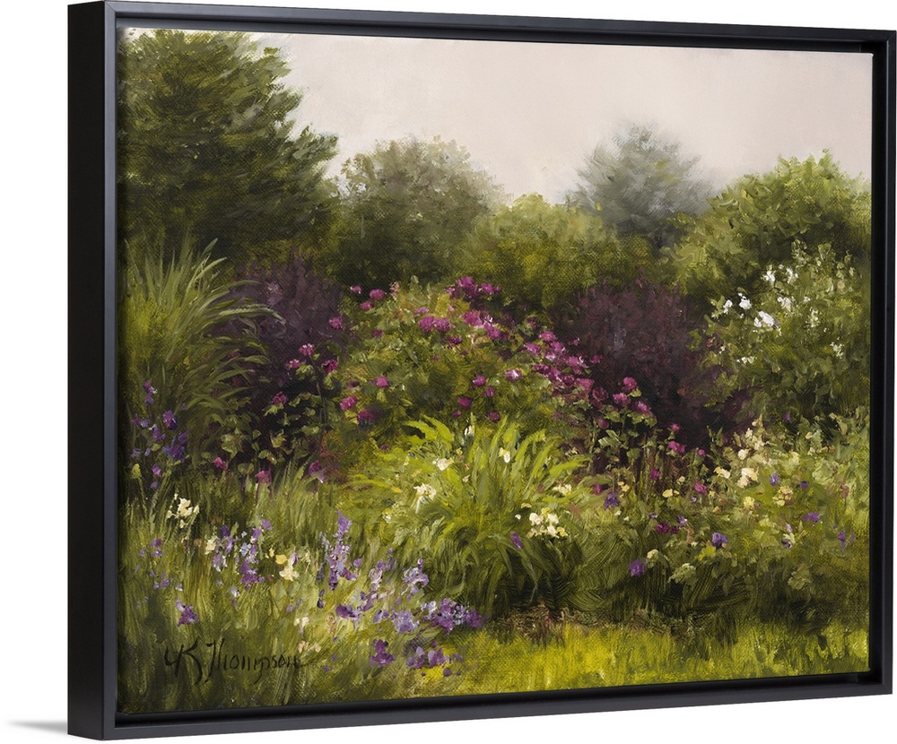 <p>Contemporary painting of an idyllic countryside scene with blossoming flowers.</p>