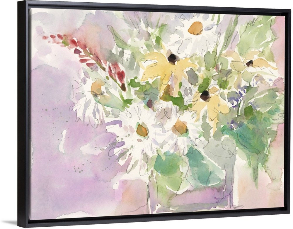 <p>A volatile watercolor painting of a bouquet of garden flowers against a purple scenery.</p>