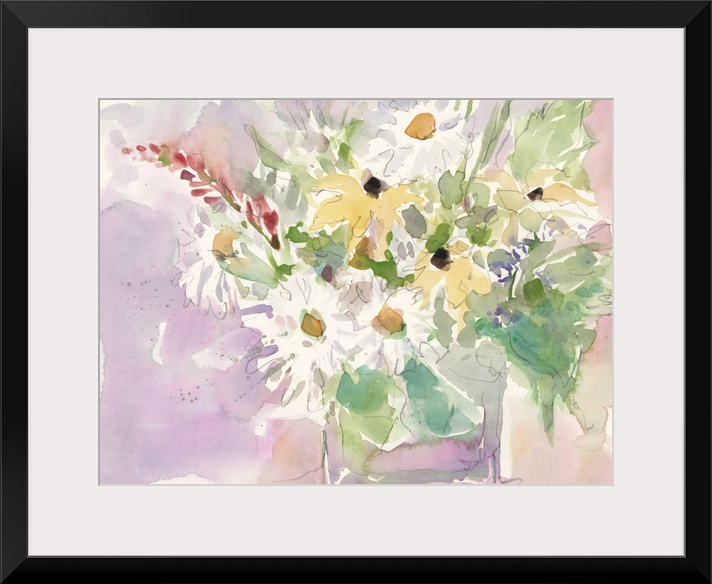 <p>A volatile watercolor painting of a bouquet of garden flowers against a purple scenery.</p>