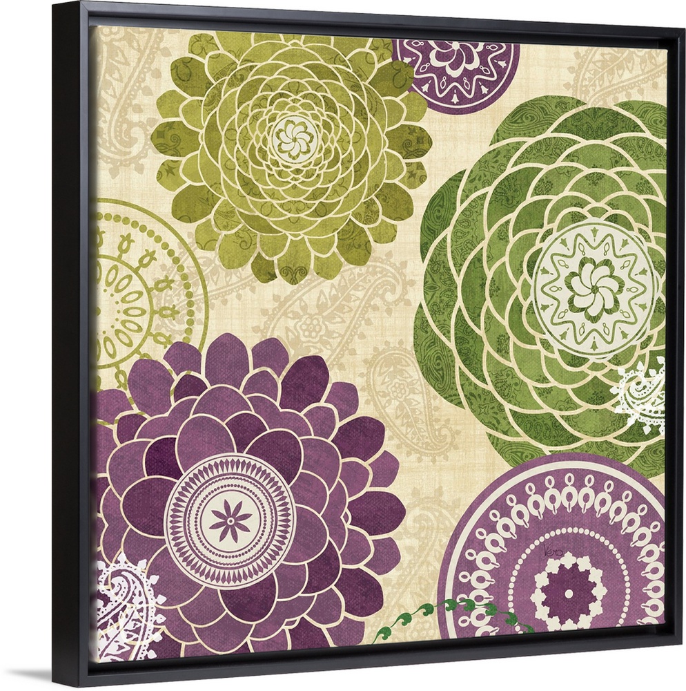 <p>Contemporary artwork of purple and green flowers hovering over a neutral toned patterned background.</p>
