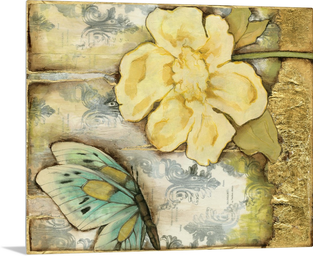 <p>Contemporary painting of a golden flower and a teal butterfly against a weathered and textured background.</p>