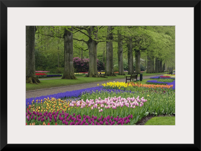 <p>Garden of daffodils, tulips, and hyacinth flowers, Keukenhof Gardens, Lisse, Netherlands, Holland</p>