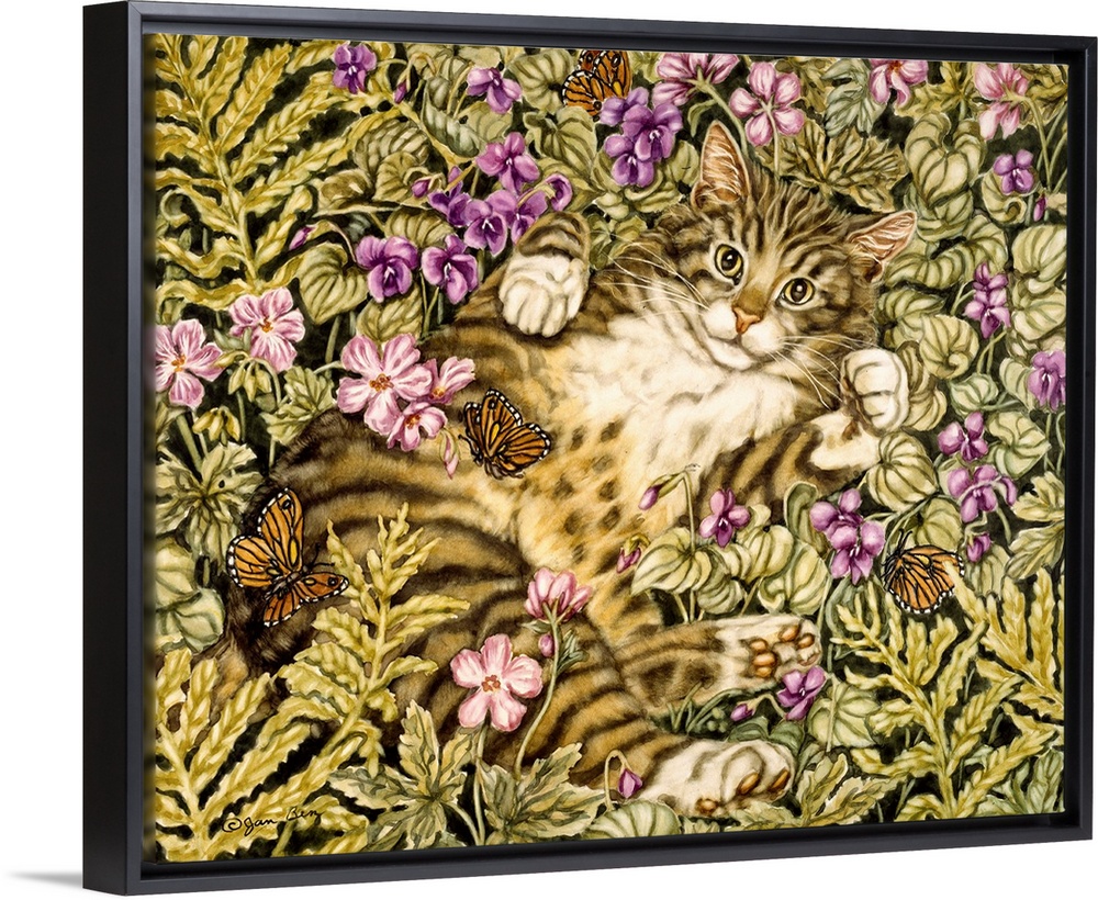 <p>Domestic tiger cat lays on its back in a bed of ferns and flowers batting at butterflies.</p>