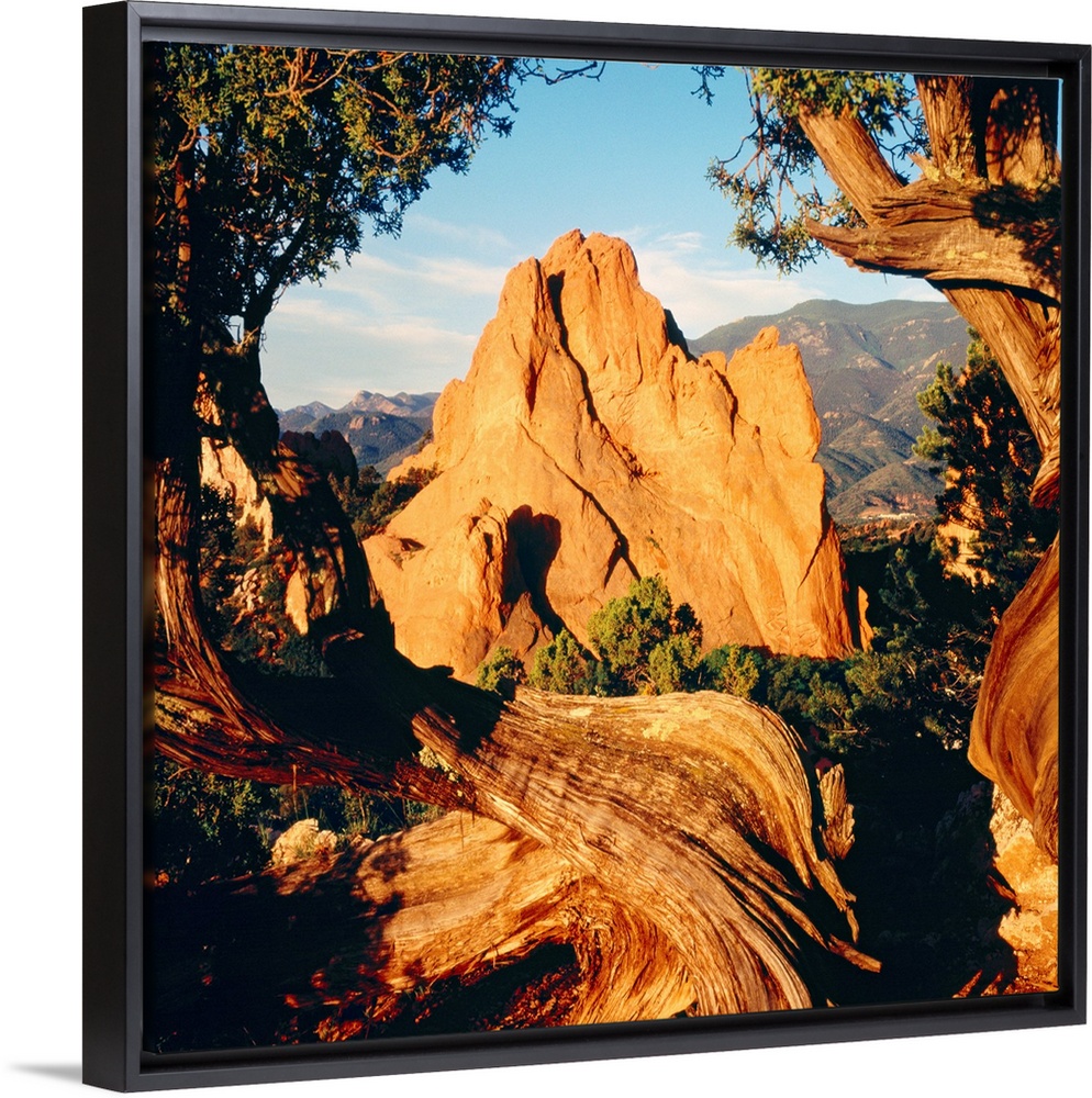 <p>Dry, wind battered trees frame the edges of this landscape photograph of natural rock formations in the desert.</p>