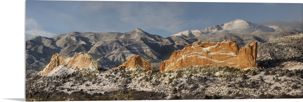 <p>USA, North America, Colorado. Garden Of The Gods, Panoramic Of Fresh Snow On Pikes Peak And Sandstone Formation.</p>