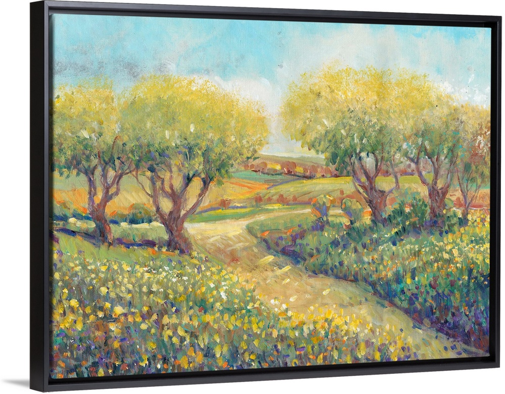 <p>Dotted brush strokes create a landscape featuring a dirt path lined by trees in the countryside with rolling hills in the background.</p>