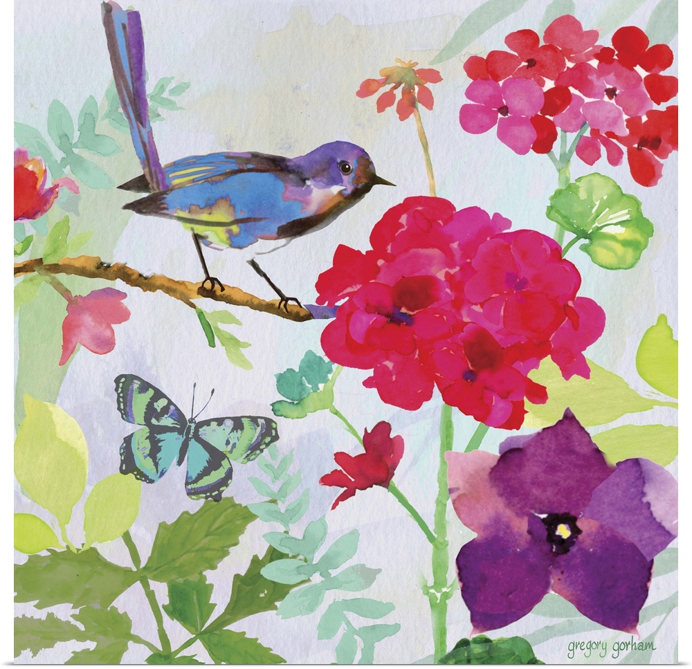 <p>Decorative square art with a colorful bird perched on a branch surrounded by red and purple flowers and a blue and green butterfly below.</p>