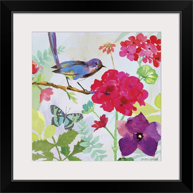 <p>Decorative square art with a colorful bird perched on a branch surrounded by red and purple flowers and a blue and green butterfly below.</p>