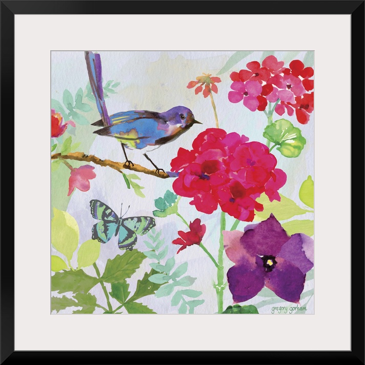 <p>Decorative square art with a colorful bird perched on a branch surrounded by red and purple flowers and a blue and green butterfly below.</p>