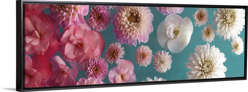 <p>Panoramic image of a group of flowers, fading from pink to white, on a teal backdrop.</p>