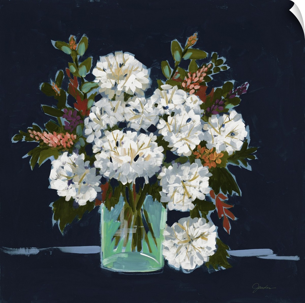 <p>A contemporary still-life painting featuring a vibrant bouquet of white flowers in a luminous green vase against a deep navy background, rendered with expressive brushstrokes.</p>